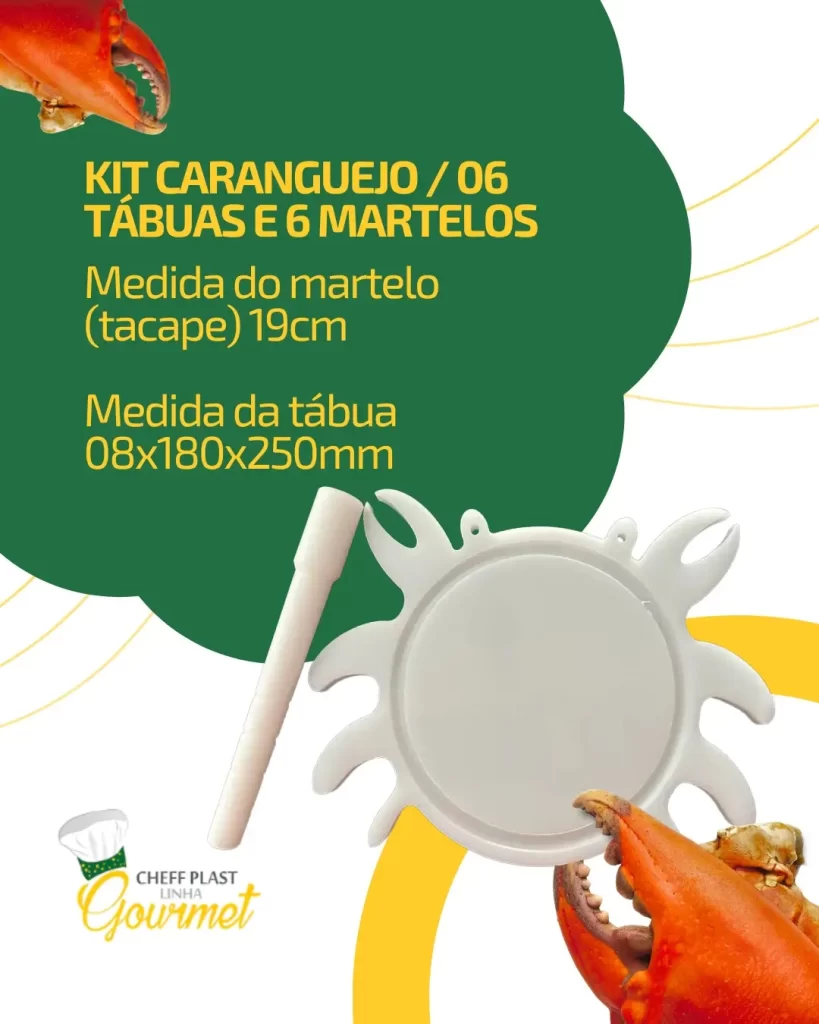 Composto por 6 chapas resistentes em PEAD atóxico e martelos práticos, ele traz toda a facilidade que você precisa para saborear caranguejos e crustáceos de forma higiênica, organizada e gourmet.